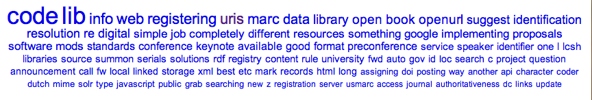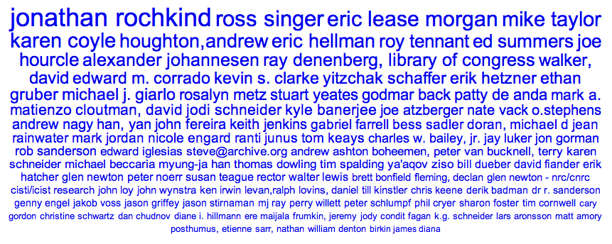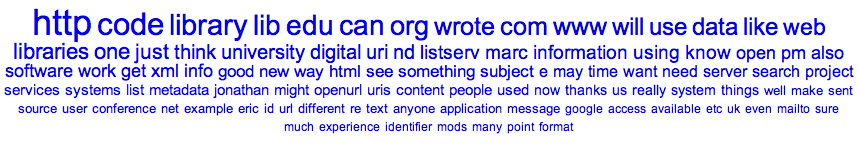 - Measure ideas – This is probably the most avant-garde service described in the proposal. Its implementation can only be done after the bulk of the DPLA’s collection has been created. Furthermore, calculating TFIDF for a set of related keyword is computationally expensive. This can be a truly useful and innovative service, especially if the reader were able to create a personal concept for comparison. But because of the time and expense, we advocate this service be implemented last.