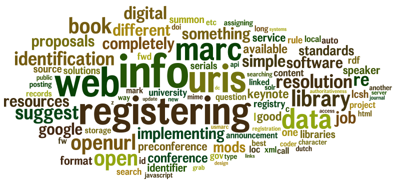 Third, this proposal does not assume very many things regarding metadata beyond the need for the most basic of bibliographic information such as unique identifiers, titles, authors, subject/keyword terms, and location codes such as URLs. It does not matter to this proposal how the bibliographic metadata is encoded (MARC, XML, linked data, etc.). On the other hand, this proposal will advocate for additional bibliographic metadata, specifically, metadata that is quantitative in nature. These additions are not necessary for the fulfillment of the proposal, but rather side benefits because of it.