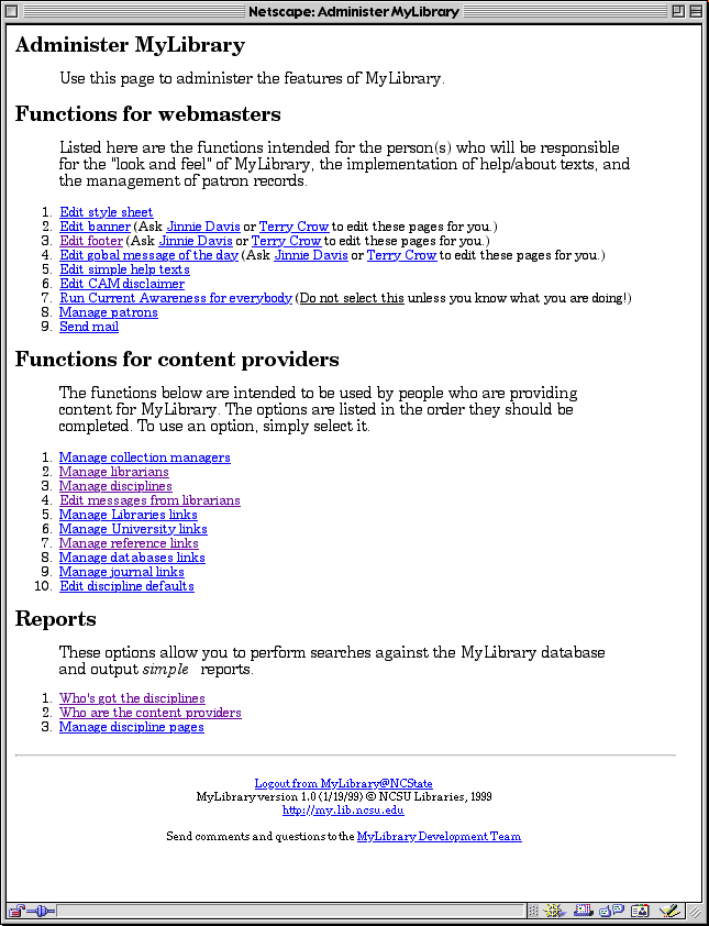To create, modify, or delete any of these items the authorized librarian selects an item from the menu and completes the resulting form. Changes take place immediately. For example, suppose somebody wanted to change the global message. They would select the Edit Global Message of the Day hotlink and enter what ever text they desired. If a new librarian where to join the library's staff, then they would select the Manage Librarians hyperlink and create a new record making sure the record was associated with at least one discipline. Consequently, users of the system who had selected a discipline equal to the discipline choosen by the new librarian would then see the new librarian's name and email address on their MyLibrary@NCState page.