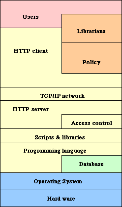 MyLibrary@NCState is grounded on a computer running Unix, and just about any computer running Unix can run MyLibrary@NCState. Unix was chosen for two reasons. First, Unix is the most commonly used operating system for large Internet services. Consequently, there exists a large number of people who can administrate Unix computers. Second, Unix is available for the widest range of hardware platforms, and since the NCSU Libraries considers the possibility of sharing the MyLibrary@NCState source code, the Libraries does not want to limit what the system can run on.