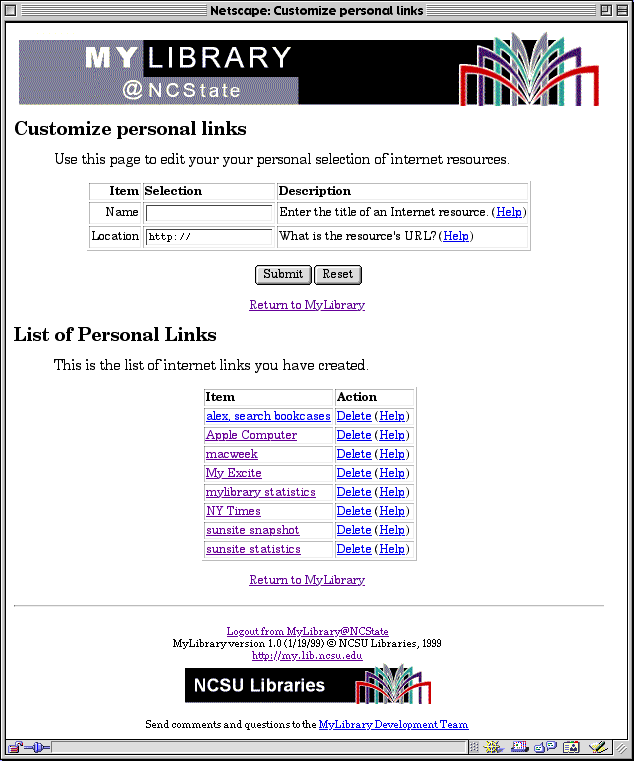 The Personal Links section allows the user to save links to Internet resources they use often that are not included in any of the sections above. No librarian can hope to collect the total sum of Internet resources and organize them into a database. Given this fact, the Personal Links section provide the opportunity for the MyLibrary@NCState user to add their own links to the system.